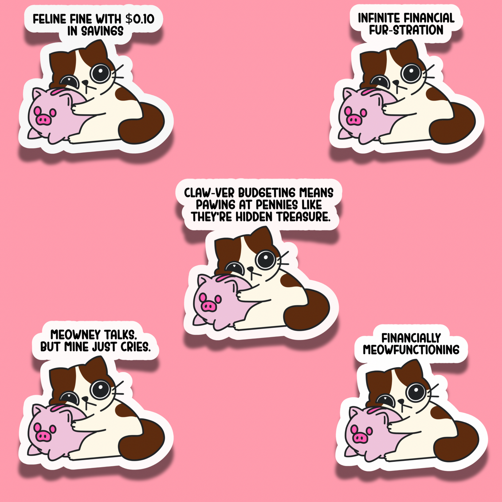 A white-and-brown cat hugging a piggy bank like its life depends on it. The perfect sticker for anyone who knows the struggle of saving up for treats (or toys!).