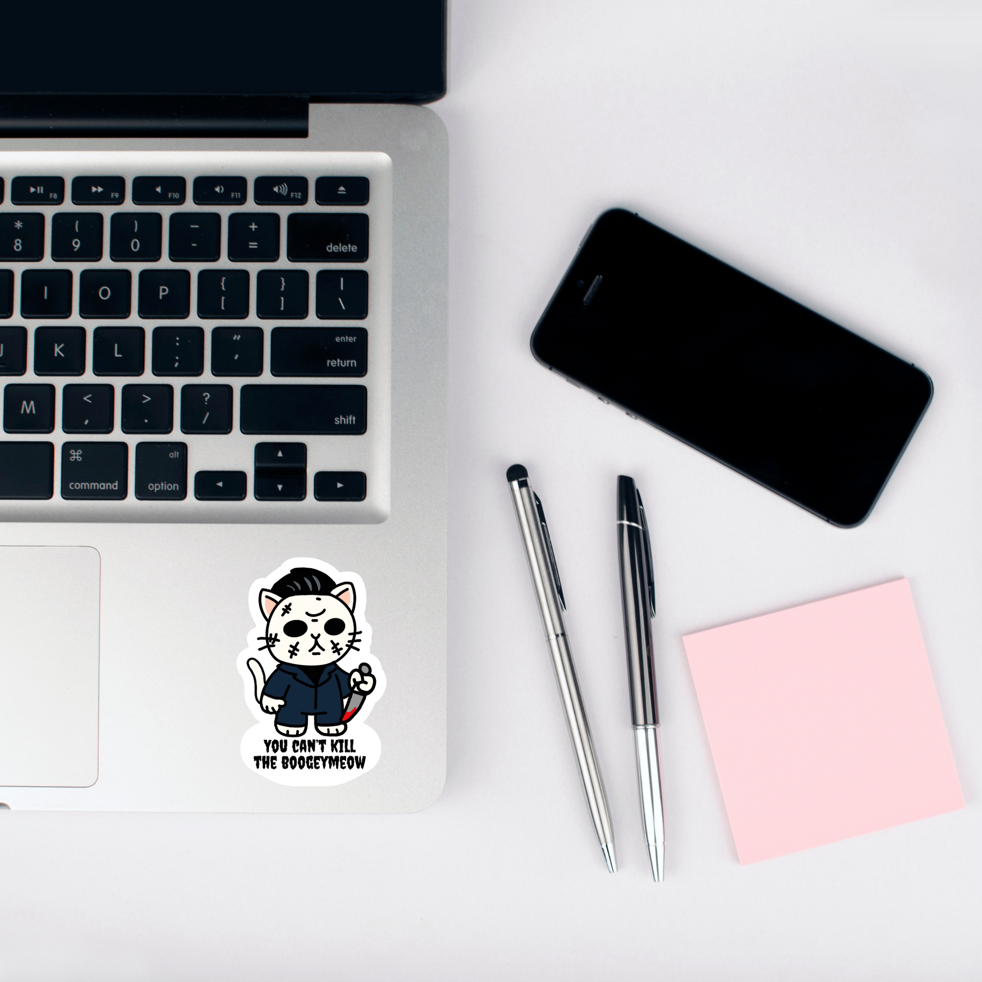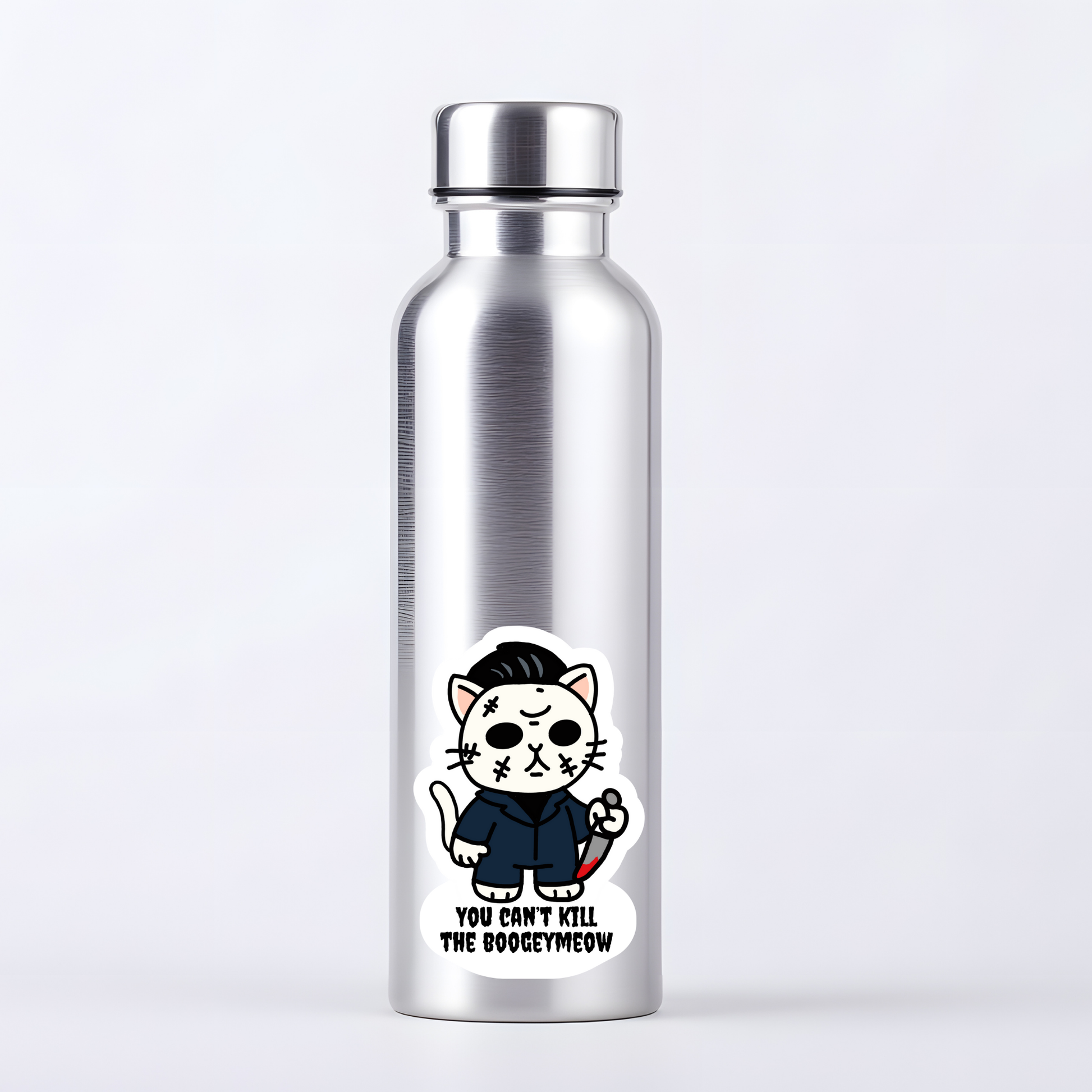 This sticker brings a chilling twist to Halloween with a cat channeling the unstoppable menace of Michael Myers. Featuring the phrase “Meowlloween Massacre – You can't kill the Bogeymeow,” it’s a purrfect parody of the iconic slasher. Creepy, clever, and clawed for terror—ideal for horror fans who love their scares with whiskers.