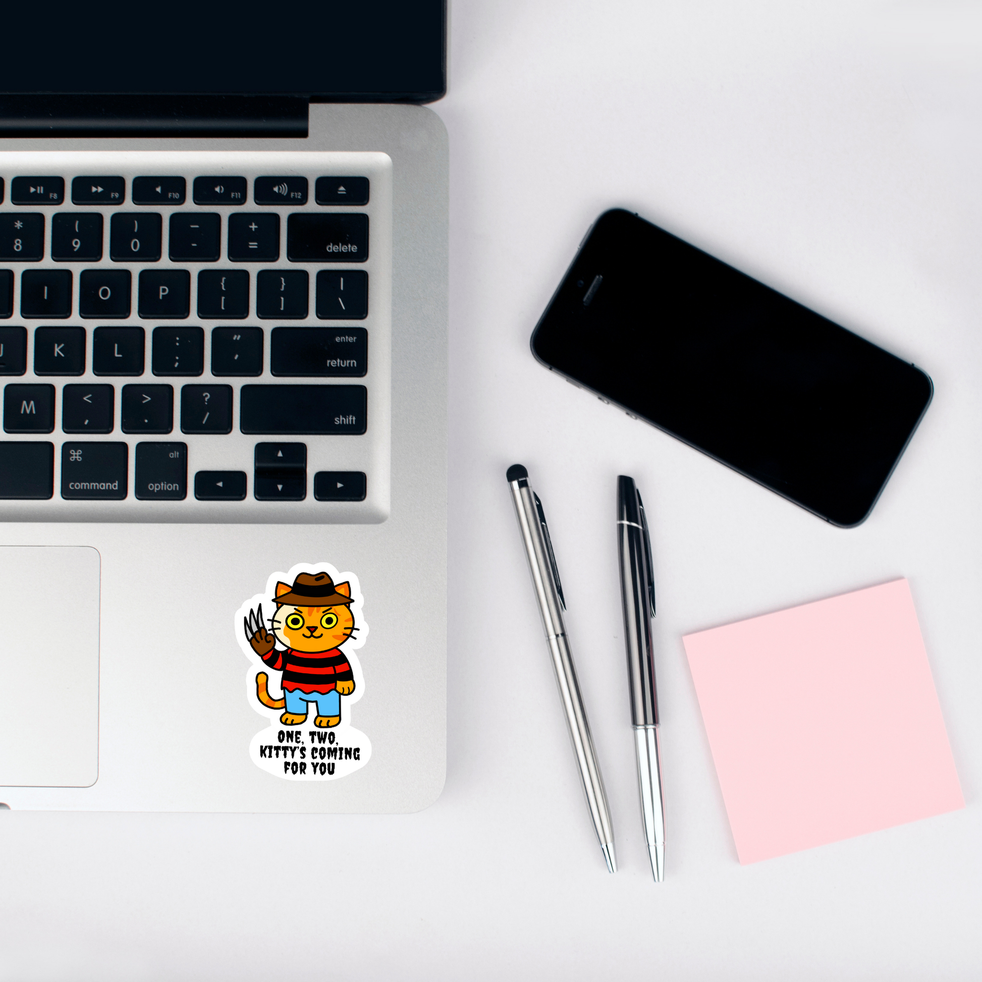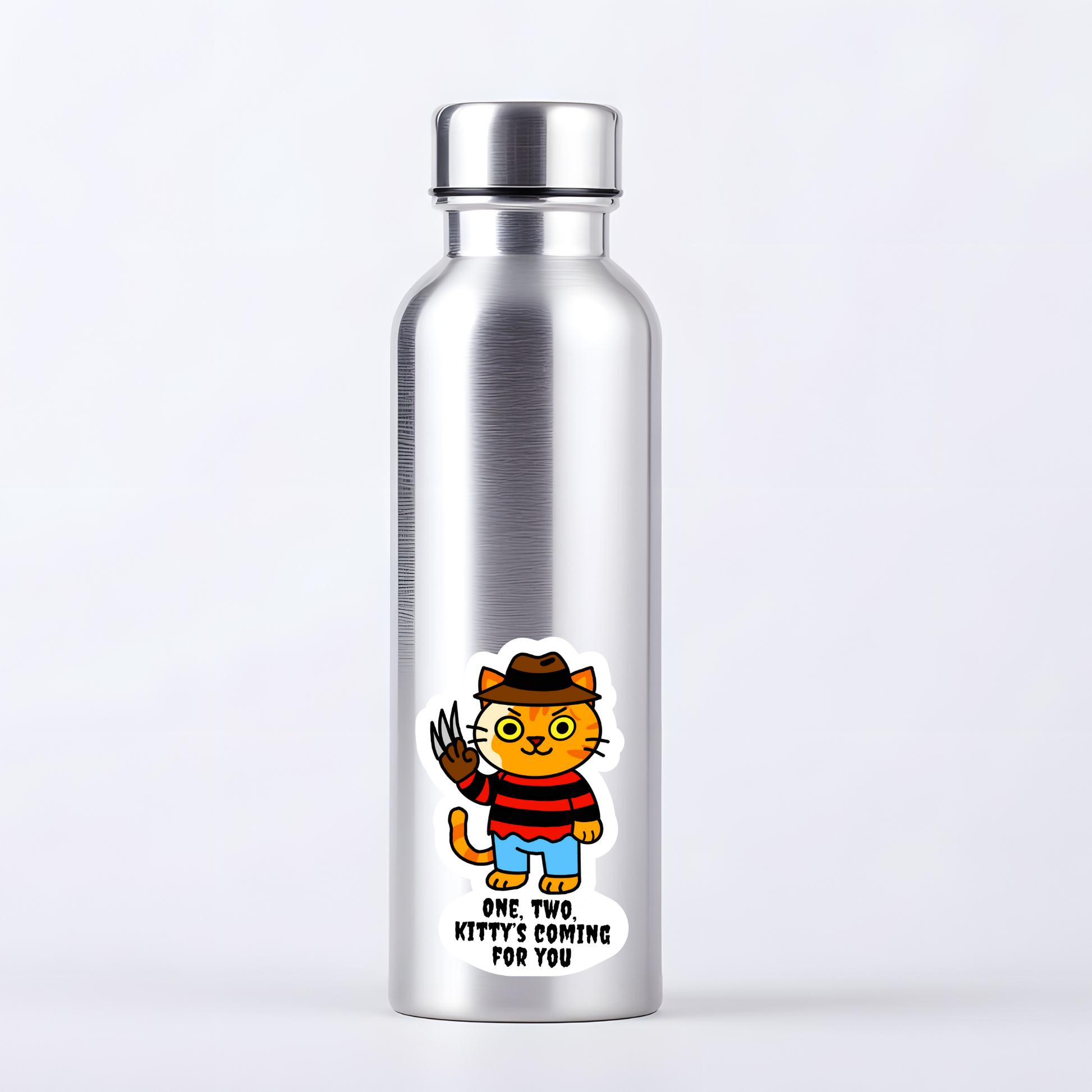 This sticker claws its way into your nightmares with a feline twist on Freddy Krueger. Featuring the haunting phrase “Meowlloween Massacre – One, Two, Kitty's coming for you,” it’s a creepy-cute homage to classic horror. Perfect for Halloween lovers who enjoy a dash of dark humour with their cat obsession.